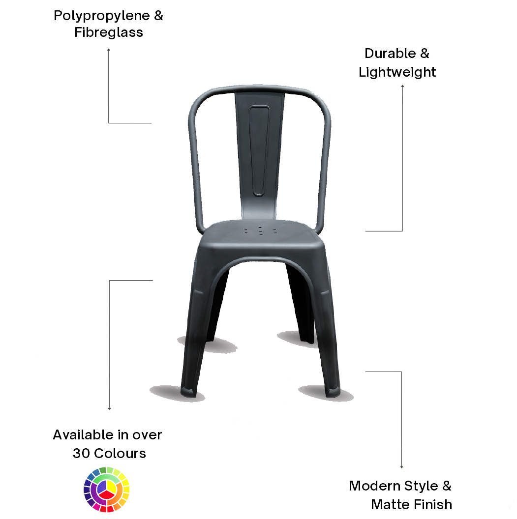 The latest and ideal outdoor seating solution has arrived for any upmarket restaurant, special social celebration, or sporting event venue. Our strong, U.V.-resistant, high-quality polypropylene chair features a matte finish to suit any business. No assembly is needed. This economical chair comes with a 3-year warranty and is stackable. It is easy to maintain – simply wipe clean with a damp cloth. The Sorrento chair is stylish, comfortable, and lightweight at 4.1 kg. We offer this product in over 30 matte colour finishes.